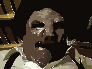This features a man with a beard and mustache, wearing a white shirt. He appears to be making an angry face as he stares into the camera. The man's facial expression is quite intense, giving off a sense of displeasure or annoyance. The photo has been edited in black and white, adding a classic touch to the image.