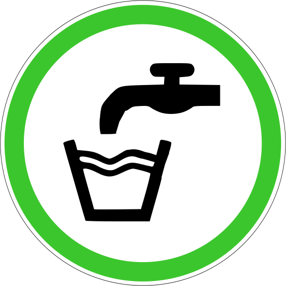 This features a green and white circle with an icon of a faucet in the center. This symbol is likely used to indicate that the water coming from this particular faucet is safe for consumption, as it has been tested and deemed clean. The colorful design of the sign makes it easily recognizable and visually appealing.