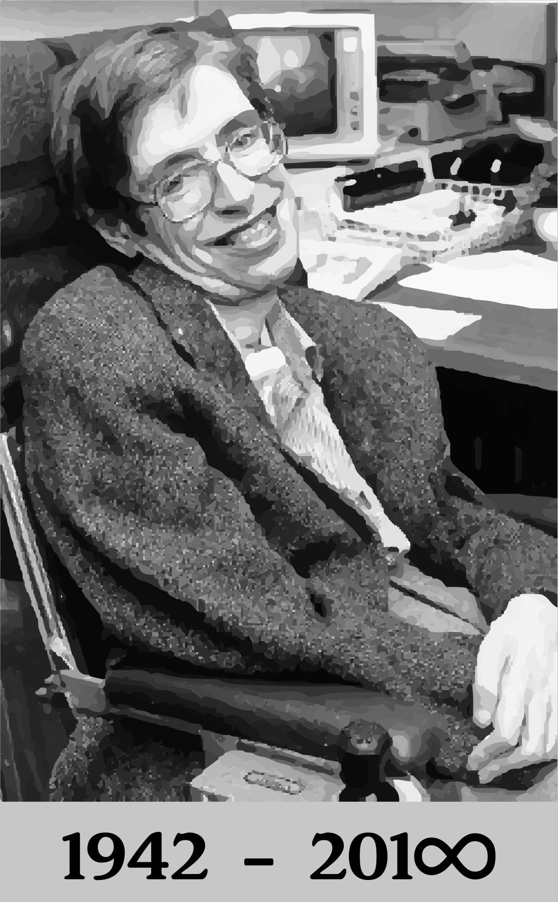 This is a black and white photo of a man sitting in a wheelchair. He has a smile on his face, giving the impression that he is happy or content. The man appears to be wearing glasses, which adds to his overall appearance. In front of him, there are two computer monitors placed on a desk, suggesting that he might be working or engaged in some form of technology-related activity. Additionally, there is a keyboard and a mouse located near the monitors, further indicating that this man may be using computers for work or leisure purposes.