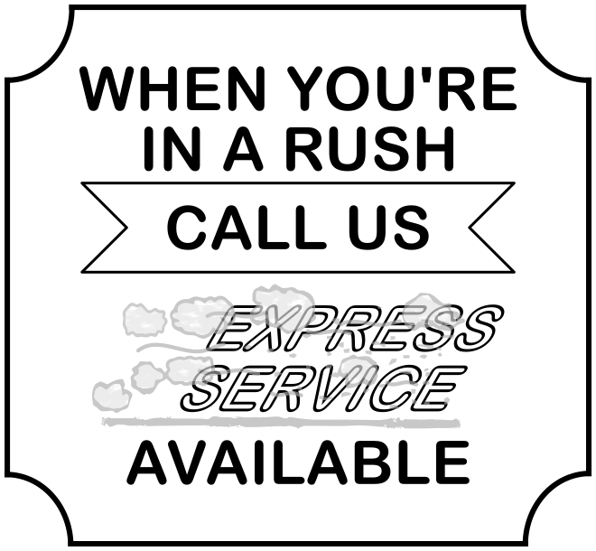This features a sign that reads "When You're in a Rush Call Us Express Service." This sign is likely used to advertise the availability of an express service for customers who need their items delivered quickly. The sign has a white background with black text, making it easy to read and understand. The use of bold letters emphasizes the importance of the message being conveyed by the sign.