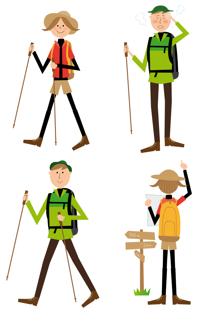 This features a collection of four cartoon-style illustrations of people walking with backpacks and hiking sticks. Each person is depicted in different poses, showcasing their journey through the outdoors. They are all wearing backpacks, which can be seen clearly on each individual's back. The illustrations are set against a white background, allowing the figures to stand out prominently. These cartoon-style people appear to be enjoying their time hiking and exploring nature together.