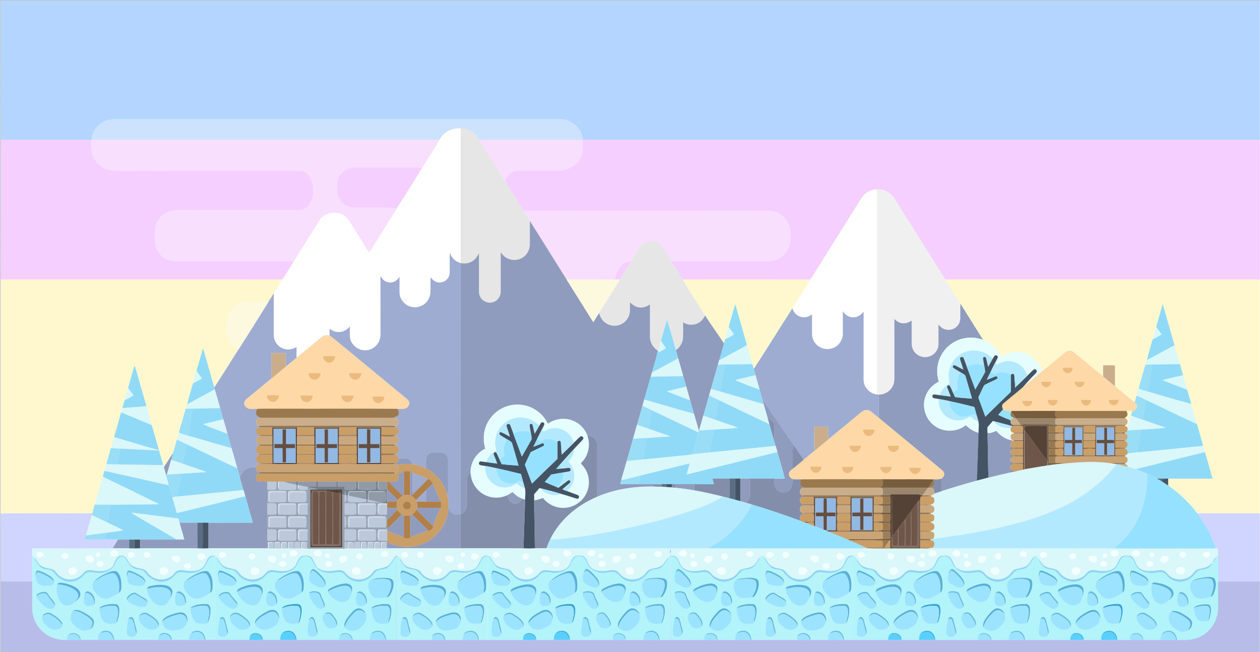 This features a snowy village with several houses and trees. The village is situated in front of a mountain range, creating a picturesque winter scene. There are at least five houses visible in the village, each with different designs and sizes. Some of these houses have snow-covered roofs, adding to the wintry atmosphere. In addition to the houses, there are trees scattered throughout the village, providing a natural touch to the landscape. The mountain range serves as a stunning backdrop for this charming winter scene, making it an ideal representation of a cozy and snowy village.