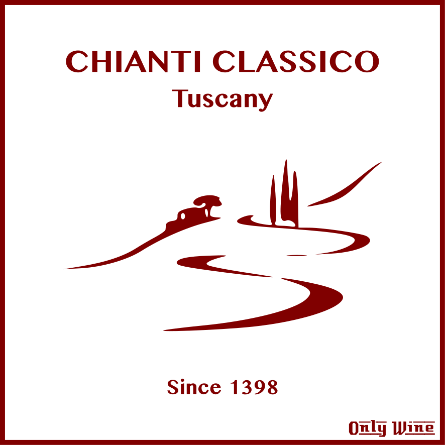 This is a red and white drawing of a wine bottle with the words "Chianti Classico" written on it. The drawing also features a picture of a vineyard, which adds to the overall theme of the wine. The label indicates that this particular Chianti Classico was produced in Tuscany, Italy. This artistic representation of the wine is likely meant to showcase its origin and quality.