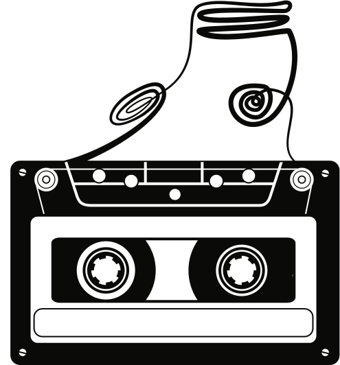This features a black and white drawing of an old cassette tape. The tape is taken out of the cassette, revealing its interior. The cassette itself appears to be vintage, possibly from the 1980s or earlier. The design of the cassette is simple yet nostalgic, reminiscent of a time when such devices were more commonplace in households and music collections.