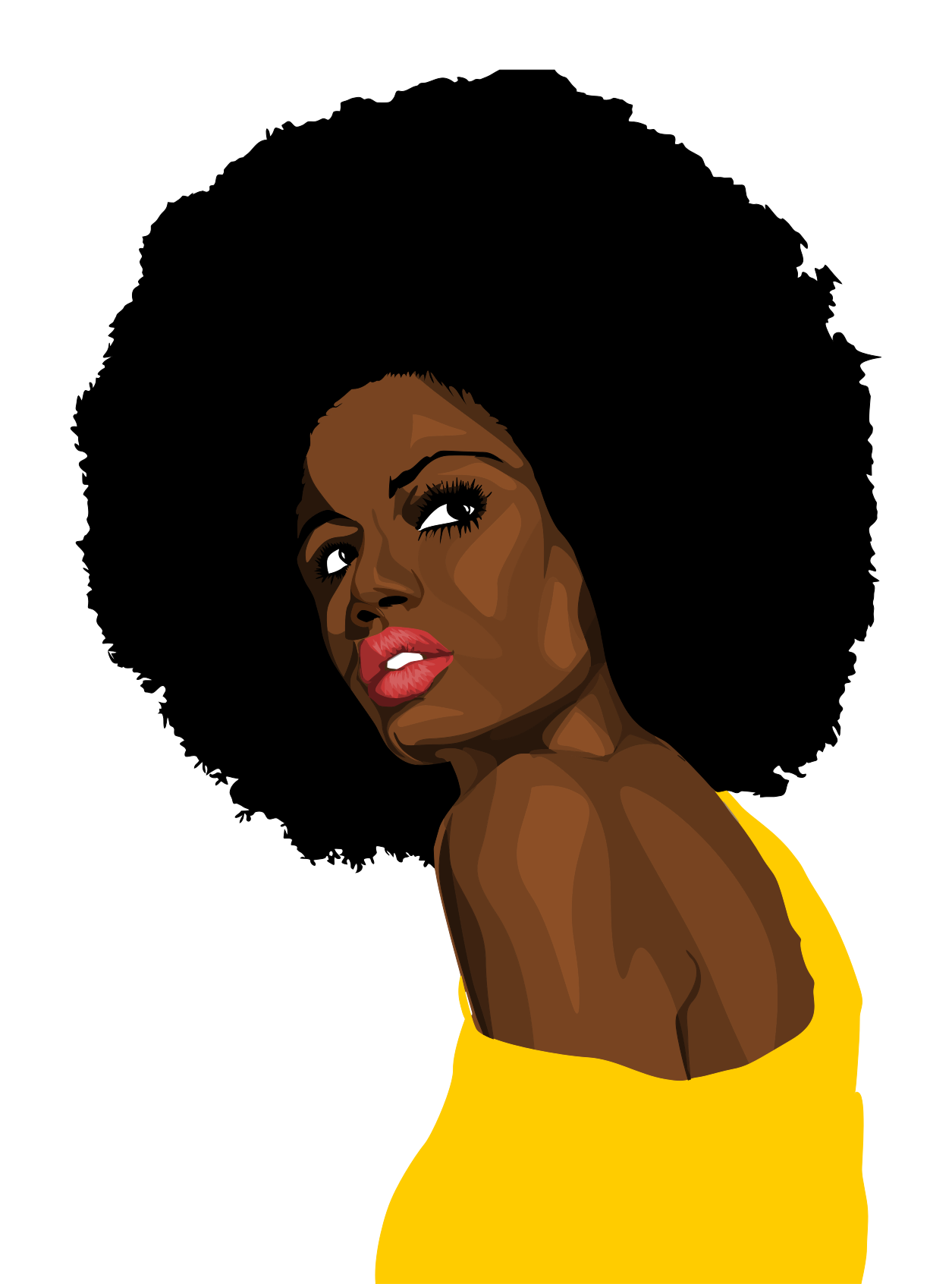 This features a beautiful black woman with curly hair, wearing a yellow top. She is looking to her left and has a pouty expression on her face. Her lips are painted red, adding a pop of color to the scene. The woman's hair is styled in an afro, which adds to her unique and vibrant appearance. The image is drawn with a black outline, giving it a more artistic and dramatic feel.