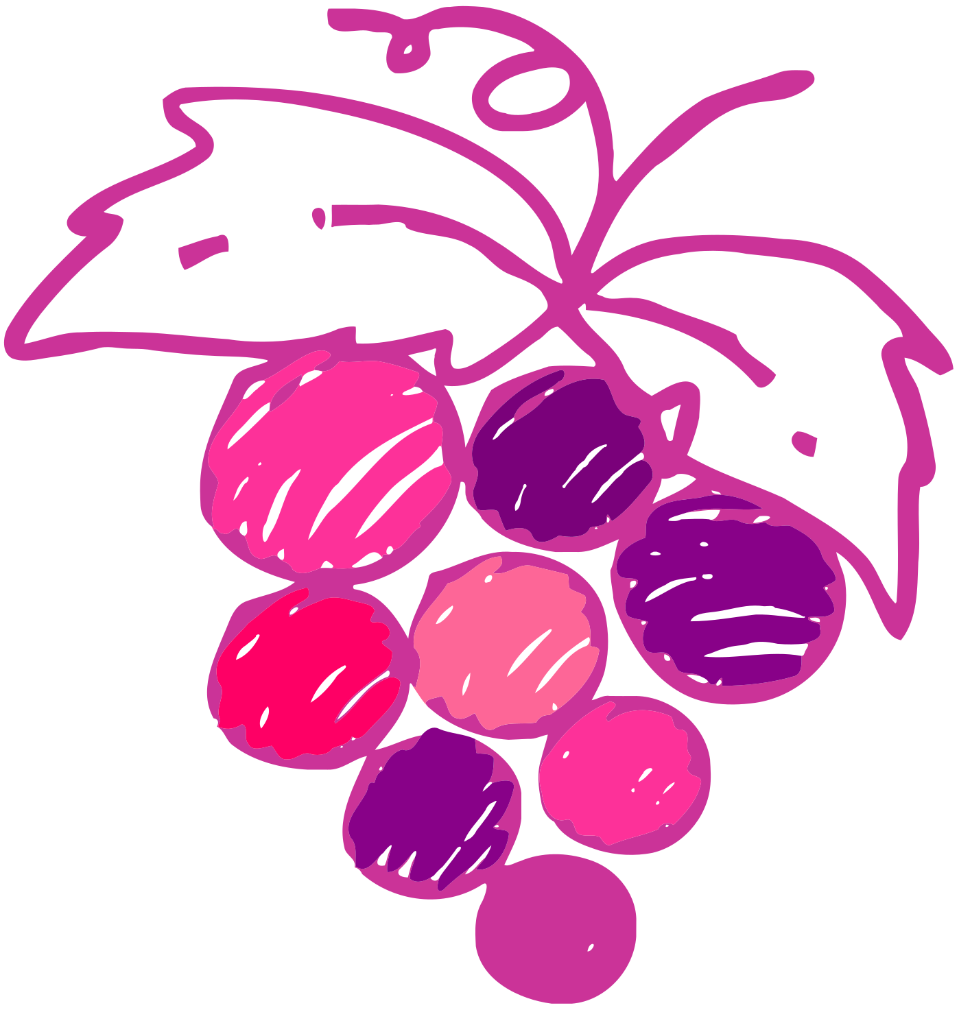 This features a colorful drawing of a bunch of grapes. There are several red and purple grapes in the picture, with some appearing to be pink as well. The grapes are arranged in an artistic manner, creating a visually appealing scene. The drawing is done in a creative style, giving it a unique appearance compared to traditional representations of grapes. Overall, this image showcases a vibrant and imaginative portrayal of the fruit.