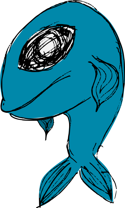 This features a blue fish with an eye in the center of its head. It appears to be a cartoon or drawn illustration, possibly created by converting it from a bitmap and then coloring it. The fish's body is depicted as having a long tail, which extends downwards towards the bottom right corner of the image. The overall composition of the drawing gives an impression of depth and dimension, making it visually appealing.