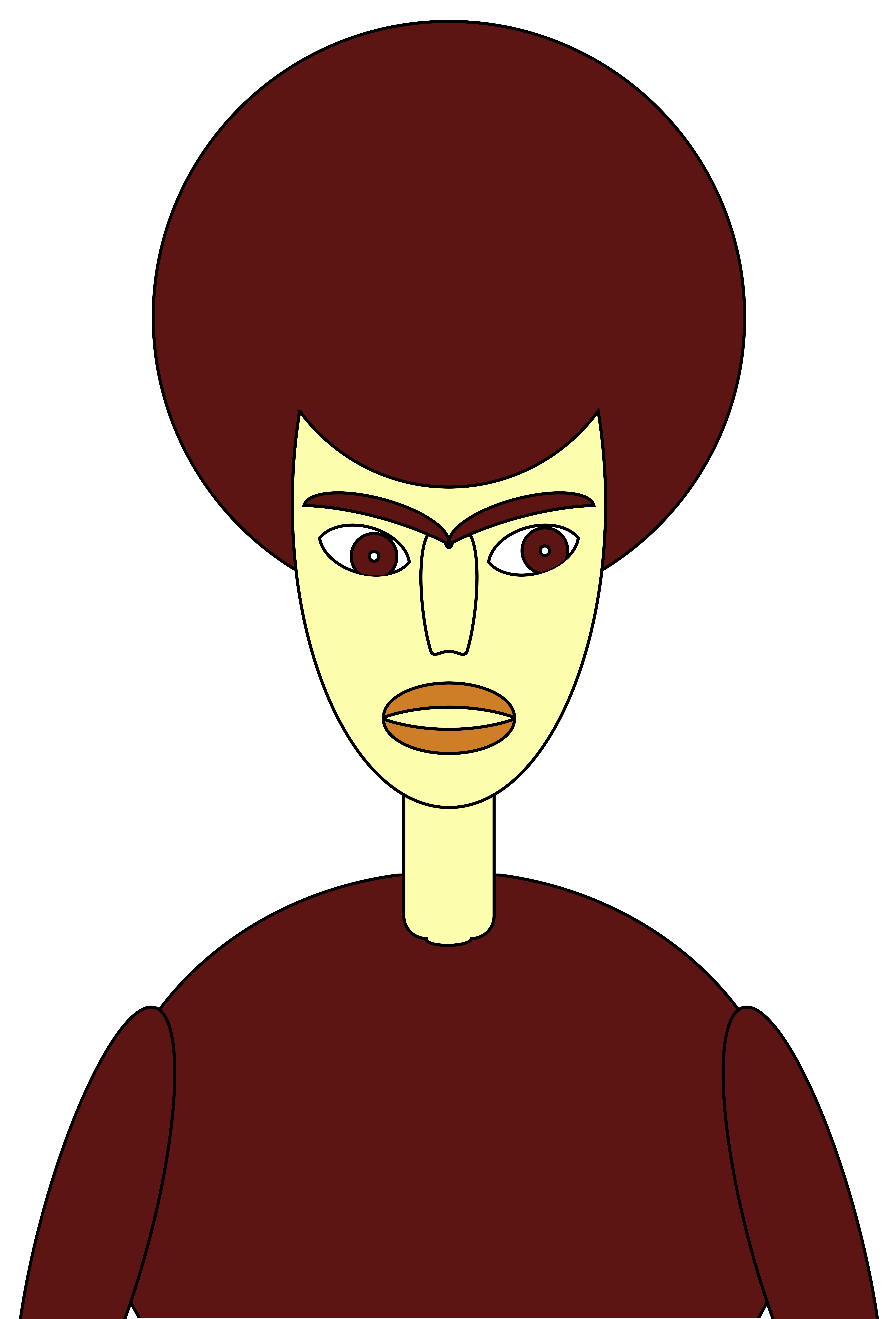 This features a cartoon drawing of a woman with brown hair, which is styled in an afro. She has a distinctive look on her face and appears to be staring at the viewer. Her facial expression suggests that she might be making a funny or quirky face. The drawing itself is quite detailed, showcasing the woman's features prominently.