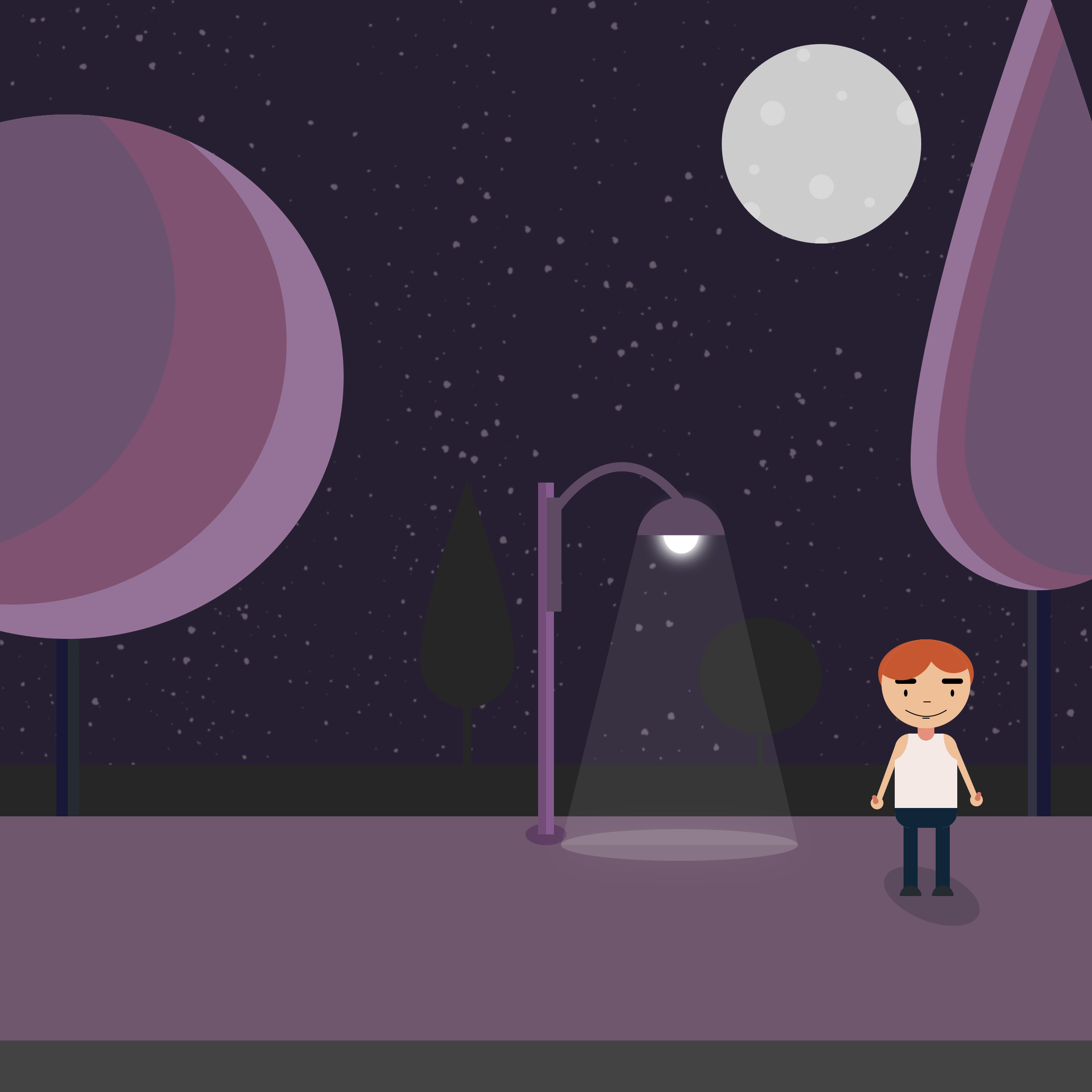 This features a man standing on the sidewalk at night, under a street light. He appears to be looking up into the sky, possibly admiring the view or observing something interesting. The scene is set in a park with purple trees and a moon visible in the background. There are two other people in the distance, but they are not the main focus of the image. A handbag can also be seen placed on the ground near one of the individuals. Overall, it's an artistic representation of a nighttime scene in a park with a man standing under a street light.