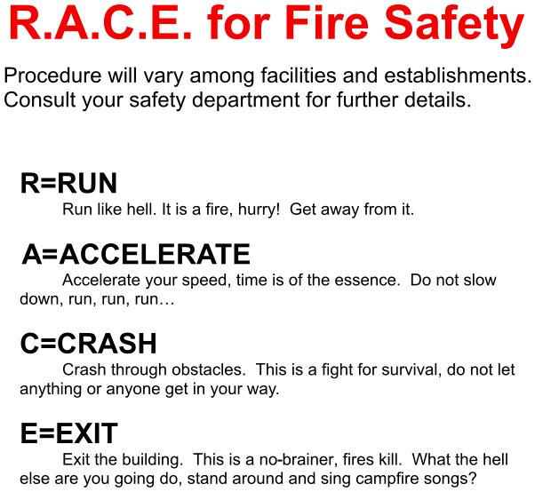 This is a parody of the RACE fire safety procedure, with humorous descriptions and phrases replacing the original text. It includes various acronyms such as "RUN", "ACCELERATE", "CRASH", and "EXIT". Each acronym has been replaced by a playful description that adds humor to the original content. The image is likely meant for entertainment or as a lighthearted reminder of fire safety precautions.
