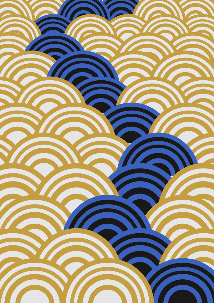 This features a pattern of circles, with each half circle made up of different sized rings. The majority of the shapes are gold or white, while some in the middle of the illustration are blue or black. These circles are arranged in various positions and sizes throughout the scene, creating an intricate and visually appealing design. The combination of colors and shapes gives the impression of a swirling, dynamic pattern that captures the viewer's attention.