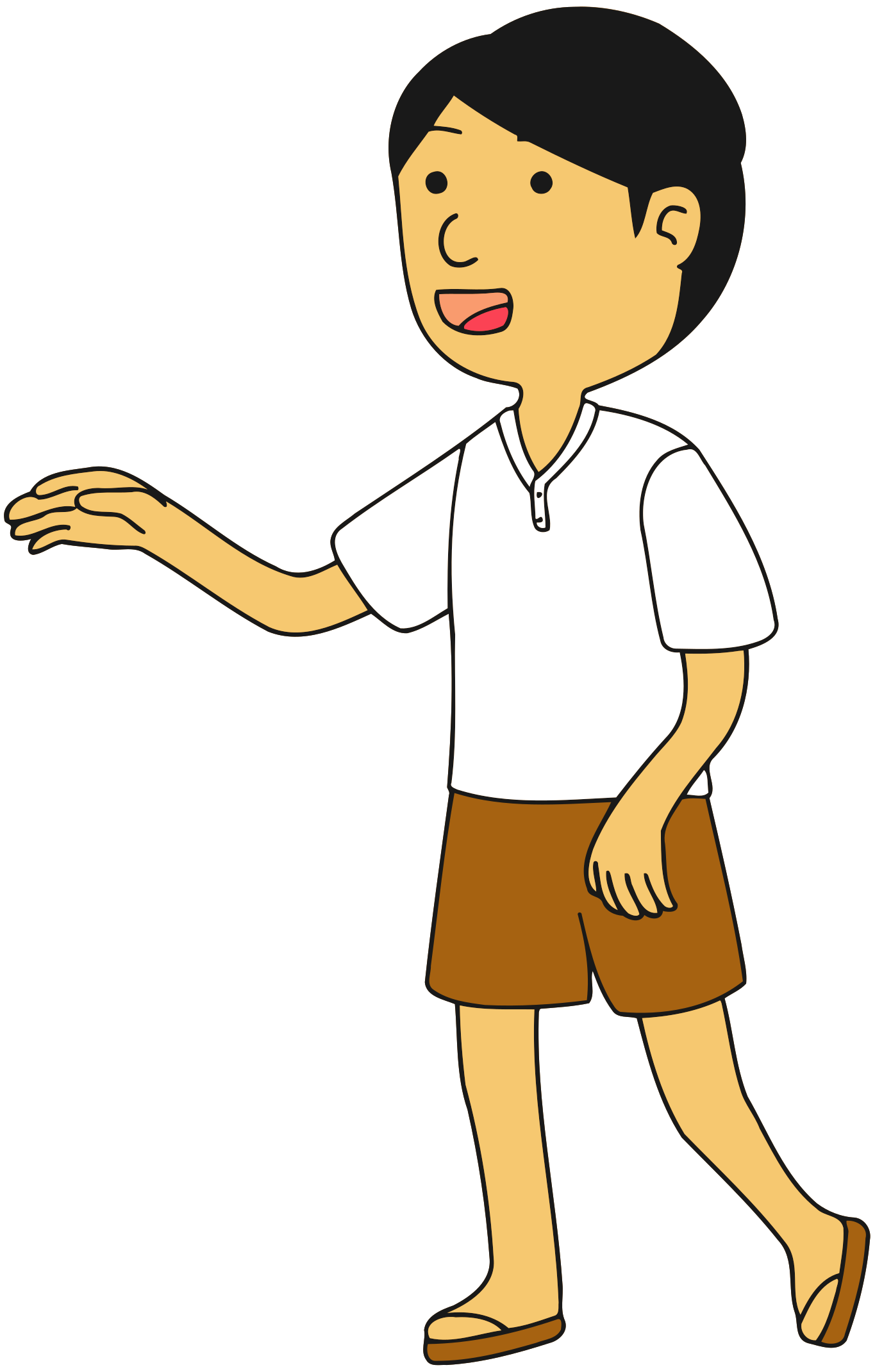 This features a cartoon drawing of a man wearing brown shorts and a white shirt. He is walking with his hand outstretched, giving the impression that he is waving or pointing at something. The man's facial expression appears to be happy and friendly as he engages in this action. The overall scene has a light-hearted and playful atmosphere, likely intended for entertainment purposes.