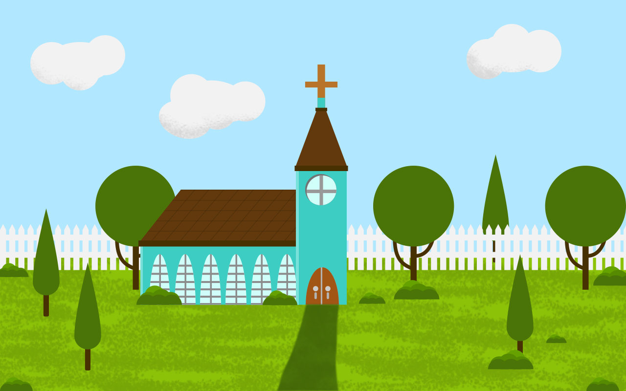 This features a church with a tall steeple and cross on top, situated in the middle of a grassy field. The church is surrounded by green trees and bushes, creating a serene atmosphere. A white picket fence can be seen behind the church, adding to its charm. The sky above the scene is blue with several small clouds scattered throughout, giving it a peaceful and idyllic appearance.