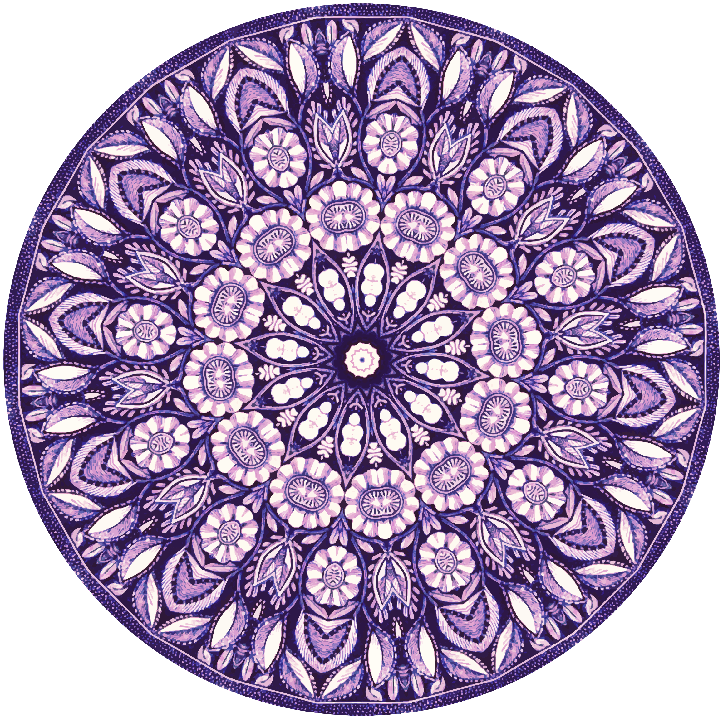 This features a large, purple and white circular design with an intricate pattern. The design is reminiscent of a decorative divider or a colorful plate, showcasing a beautiful blend of colors and shapes. The center of the circle has a small hole, adding to its visual appeal. The overall composition of the image creates a sense of depth and complexity, making it an interesting focal point for any space.