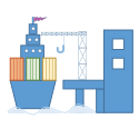 This features a large blue cargo ship docked at a blue port. A crane is extending towards the ship, likely to load or unload cargo. In addition to the cargo ship and crane, there are several smaller buildings in the background, including one that appears to be a warehouse. The scene also includes a small boat floating near the edge of the image.