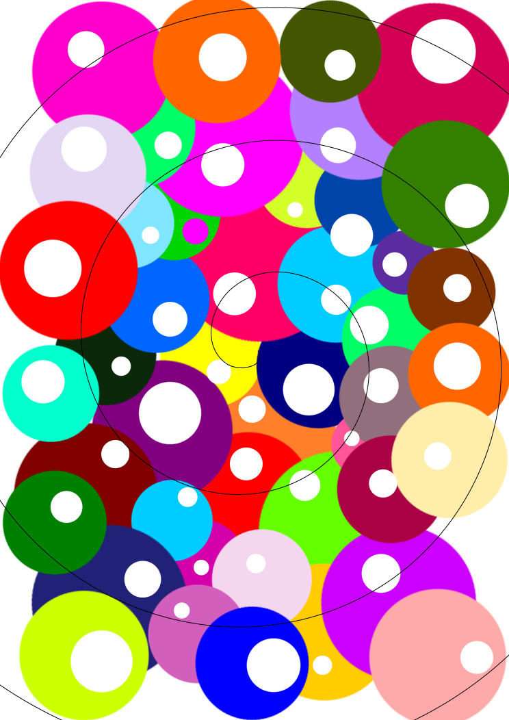 This features a large, colorful circle made up of various colored circles. These smaller circles are scattered throughout the larger circle in different positions and sizes, creating an eye-catching pattern. There is a mix of colors, including red, orange, yellow, green, blue, pink, and purple. Some of these circles are placed closer to the center of the large circle while others are positioned more towards the edges. The overall effect is a vibrant and lively display that captures attention with its bold and diverse color scheme.