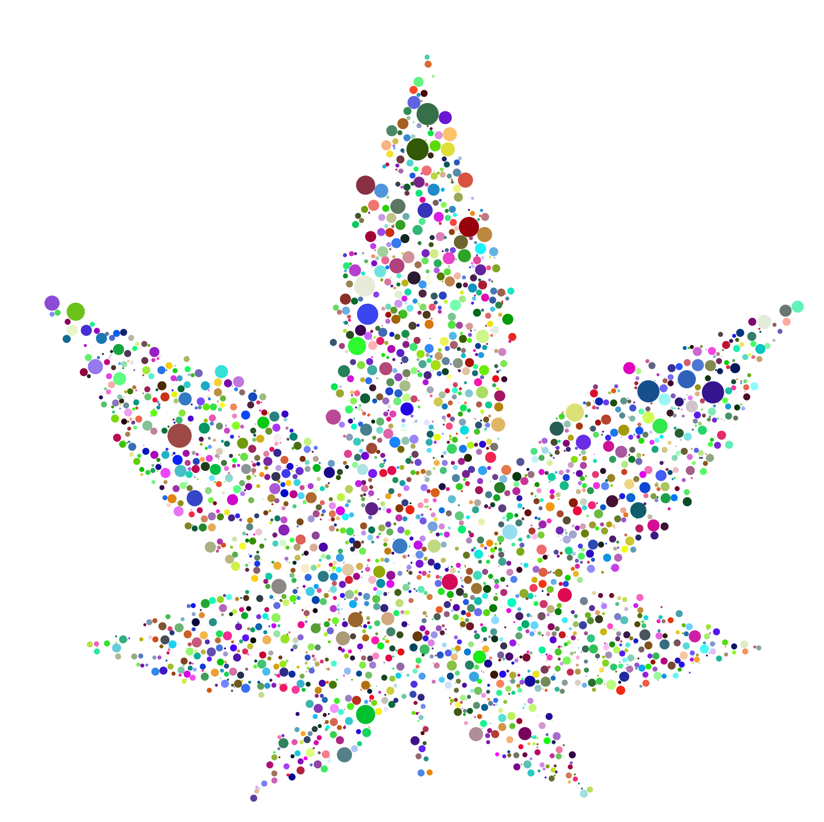 This features a large, colorful, and detailed illustration of a marijuana leaf. The leaf is composed of many small circles that make up the intricate design. These circles are arranged in various sizes and colors, creating an eye-catching and vibrant visual effect. The overall composition of the image showcases the beauty and complexity of the marijuana plant's structure.