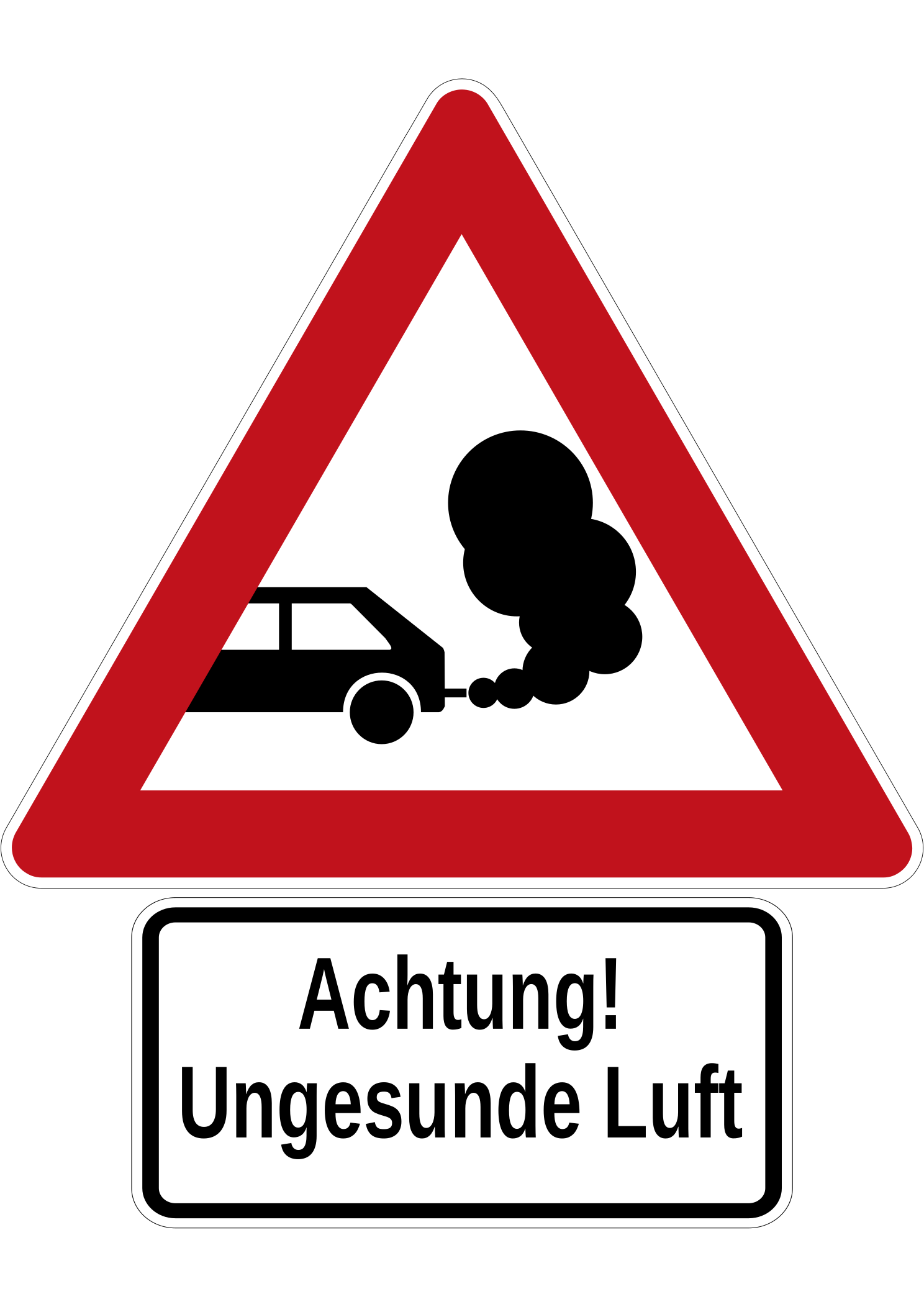 This features a red and white sign with an illustration of a car emitting smoke. The sign is written in German, which reads "Achung! Unesdnde Lufte" or "Attention! No Smoke." This sign is likely used to convey the importance of reducing air pollution and promoting cleaner transportation methods. The image also includes a sticker on the bottom right corner that adds an extra layer of visual interest to the scene.
