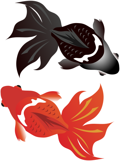 This features two different colored fish, one red and the other black. They are both placed in a white background, which makes them stand out prominently. The red fish has an orange tail with yellow accents, while the black fish appears to be a combination of blue and brown colors. These vibrant fish are likely used as decorative elements or for artistic purposes, given their striking appearance against the plain white backdrop.