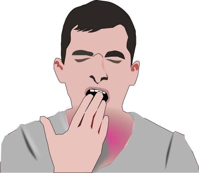 This features a man with his mouth wide open, possibly yawning or making a funny face. He has his hand up to his throat, as if he is trying to hold back laughter or express discomfort. The man's facial expression and body language suggest that he might be in the middle of an amusing conversation or experiencing some form of physical discomfort.