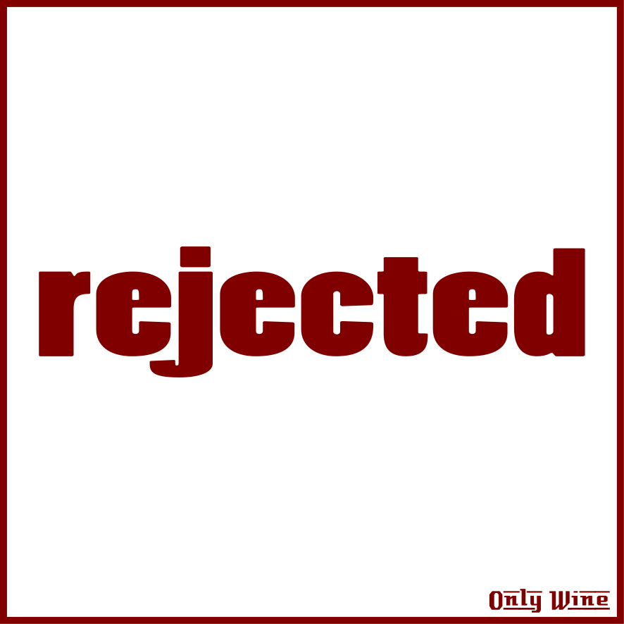 This is a red and white sign that reads "rejected" in bold letters. It appears to be an advertisement or promotional material, possibly for a wine brand. The use of the word "rejected" could suggest that this particular product has been discarded or discontinued, but it is also possible that it is being used as a marketing strategy to create a sense of exclusivity and uniqueness. The sign's design is simple yet effective in conveying its message.