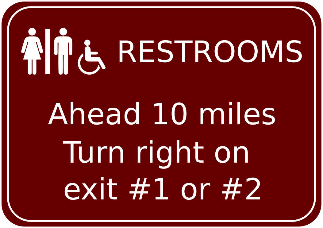Tags: parody, road sign, restroom, 10 miles ahead, turn right on exit 1 or 2, sign restroom