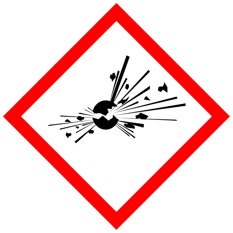 This features a red and white hazard symbol, which is part of the Globally Harmonized System of Classification and Labelling of Chemicals (GHS). This system was established by the United Nations to provide a consistent approach to classifying and labeling chemicals worldwide. The hazard symbol in this case represents an explosion or fire risk, with arrows pointing outward from the center. The image is in black and white, which adds a classic touch to its appearance.