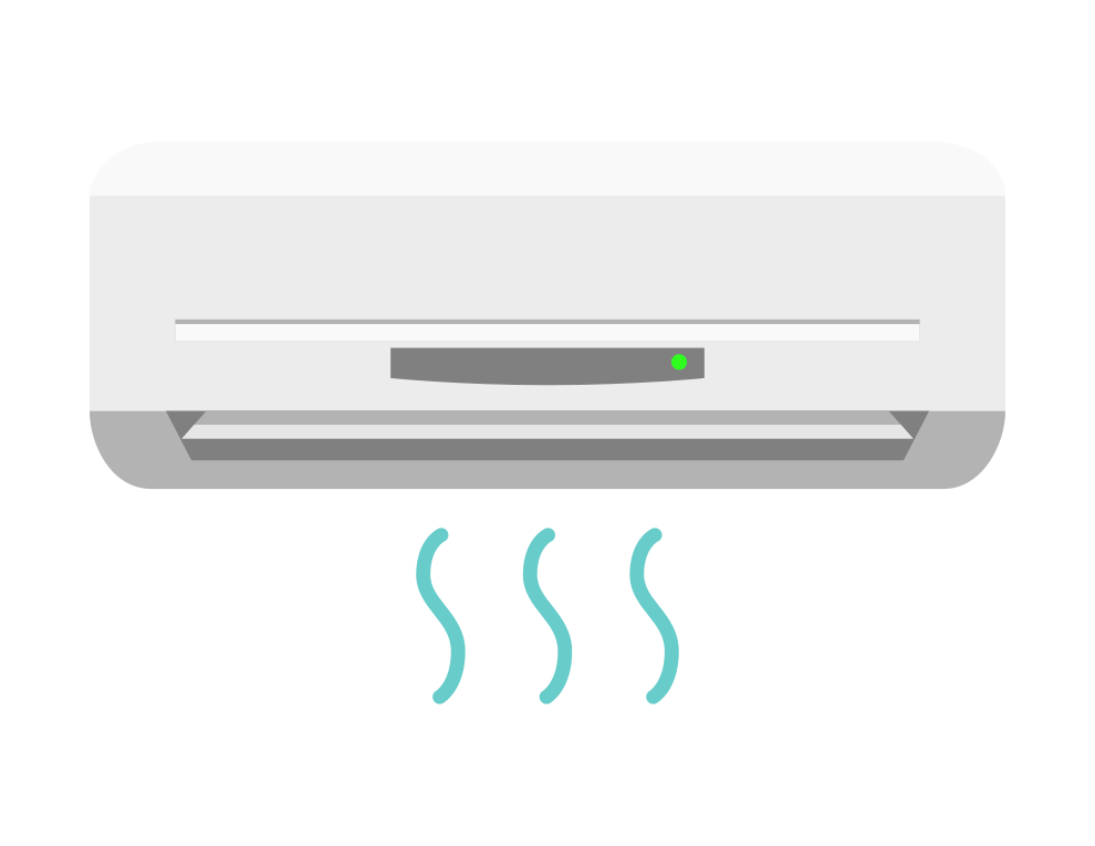 This features a white air conditioning unit with a green power light on it. Below the air conditioner, there are three curved blue lines that indicate cool air is blowing from it. These lines create an interesting visual effect and add to the overall design of the illustration. The air conditioner appears to be in good working order, as evidenced by its green power light. This image could potentially be used for various purposes such as advertising or educational materials related to home appliances and energy efficiency.