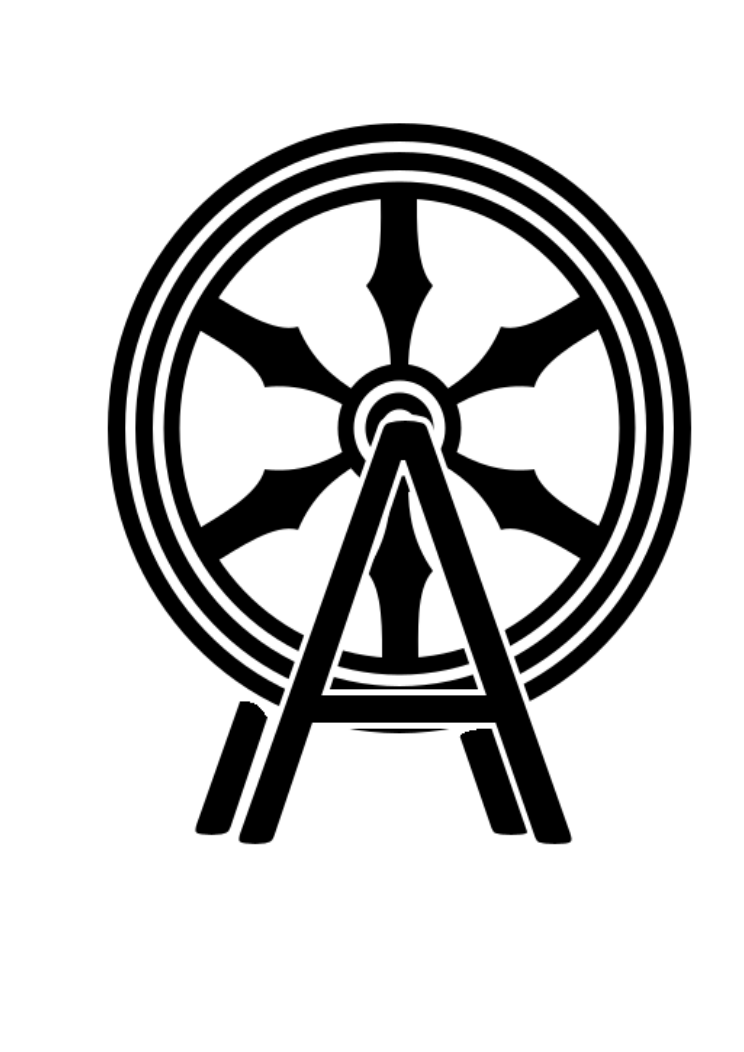 This features a black and white logo of an old-fashioned wheel, which is the central focus of the design. This wheel has a unique shape with multiple spokes, giving it a vintage appearance. The logo appears to be a combination of a circle and an arrow, creating a visually appealing symbol. The overall design gives off a sense of nostalgia and charm, making it an interesting piece for various applications such as branding or decorative purposes.
