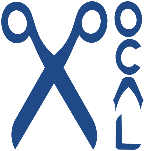 This features a blue and white pair of scissors, with the word "OCAL" written in front of them. The scissors are open, showcasing their sharp blades. The word "OCAL" is formed by dividing the OCAL scissors into shapes, creating an interesting visual representation of the brand name. This unique design makes for a memorable and eye-catching logo.