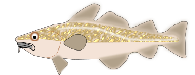 This features a large, colorful fish with a gold and white body. It appears to be a cartoon or illustration of the fish, as it is not a real-life creature. The fish has a long snout and is positioned in the center of the scene. Its vibrant colors make it stand out against the background, which consists of a plain white surface.