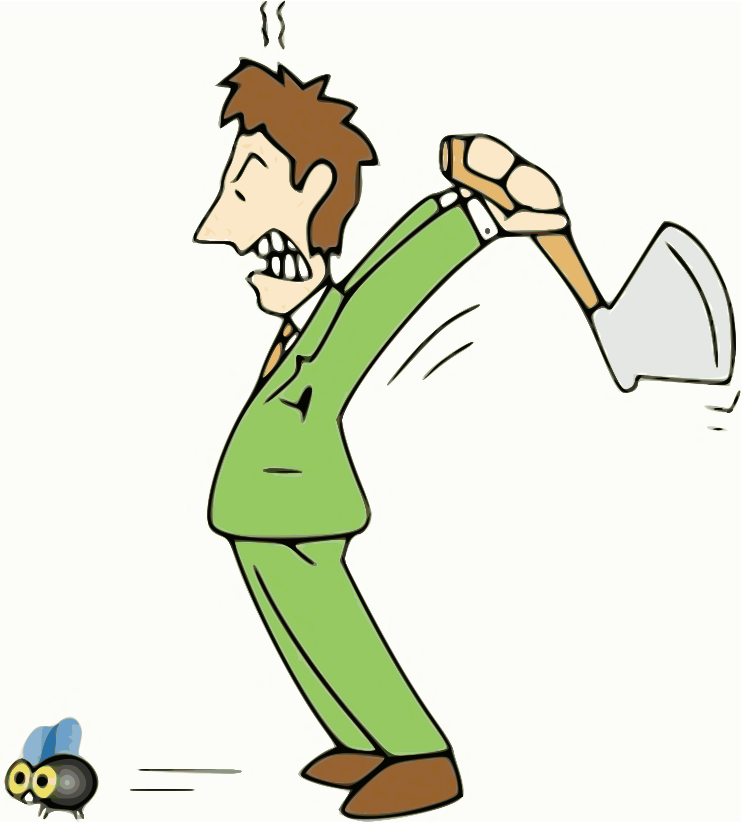This features a man dressed in green, holding an axe and attempting to hit a fly. He appears to be very angry as he swings the axe at the insect. The scene is set outdoors with some grass visible around the man. The man's facial expression suggests that he is determined to get rid of the fly, possibly due to its annoying presence or potential threat to his surroundings.