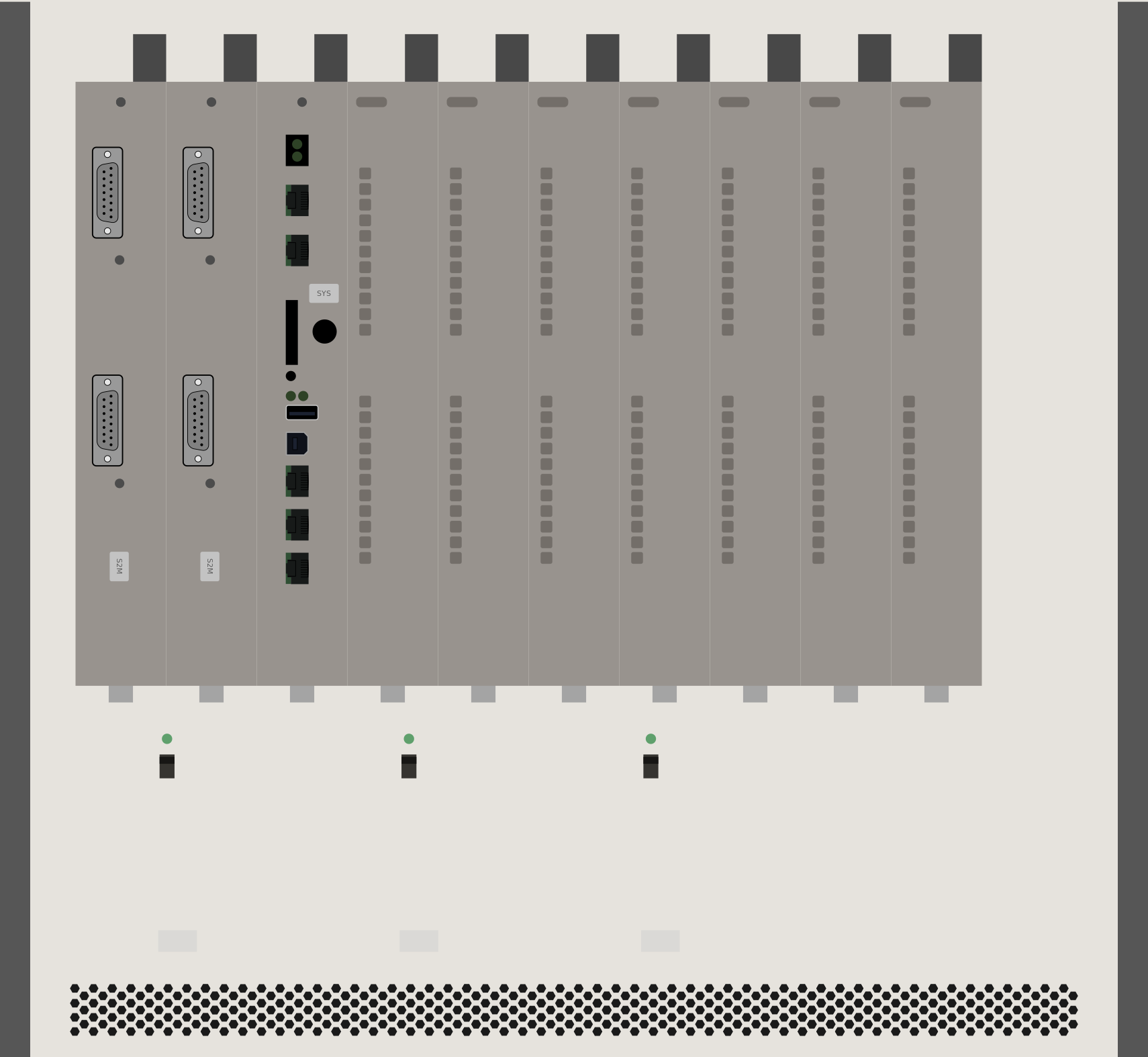 This features a large, gray electronic device with multiple buttons and switches. There are several rows of buttons on the front of the device, some of which have green lights next to them. Additionally, there is a row of small black dots located above the buttons. This electronic device appears to be an important piece of equipment or machinery, possibly used for monitoring or controlling various systems. The image captures a close-up view of this intricate and complex machine, showcasing its many features and functions.