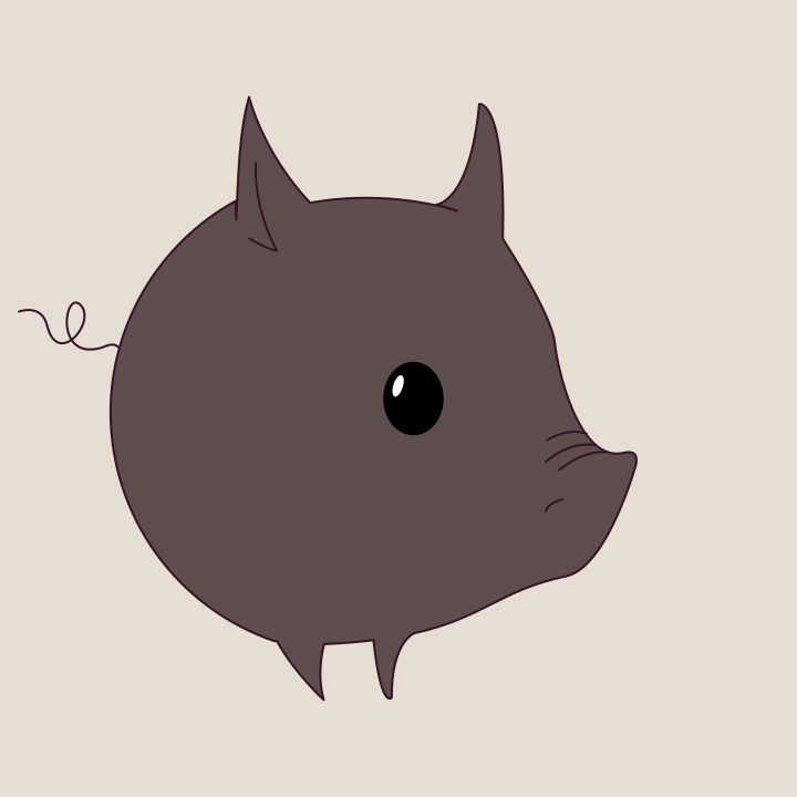 This features a round cartoon pig with a black body and brown ears. It has two small eyes, one on the left side of its face and another on the right side. The pig's nose is slightly curved upwards, giving it a playful appearance. The overall design of the pig is simple yet charming, making it an appealing subject for various purposes such as illustrations or decorative items.