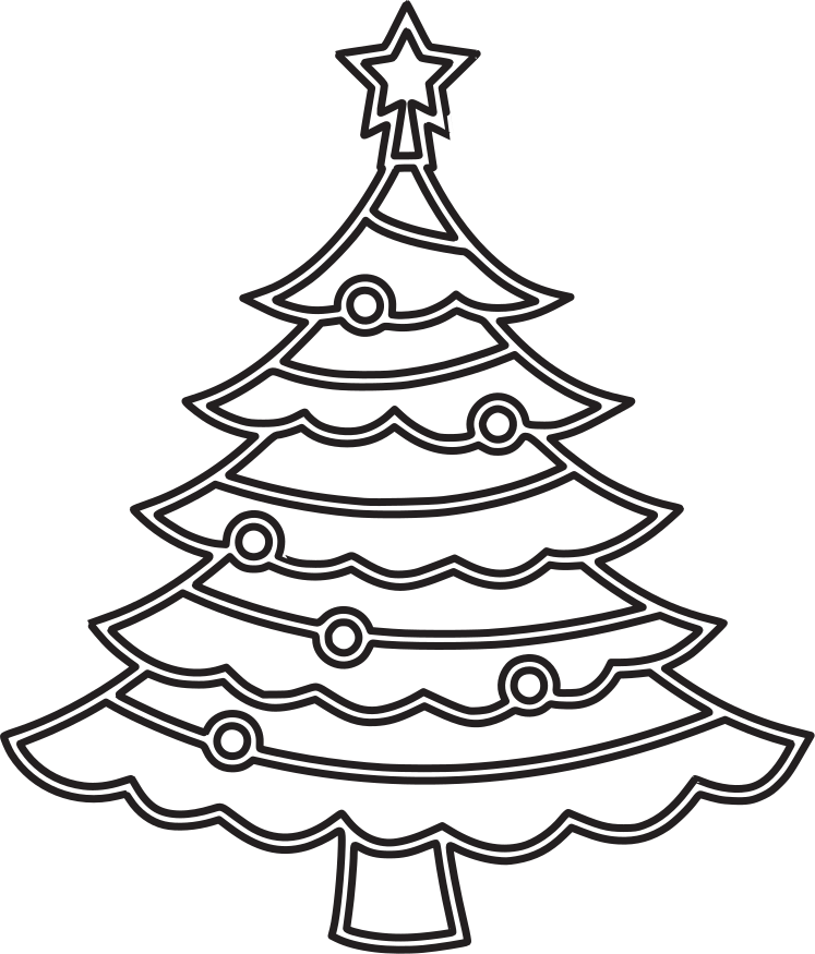 This features a black and white drawing of a Christmas tree. The tree is adorned with ornaments, including stars and circles, which are placed at various heights on the branches. The overall design gives an impression of a classic, traditional Christmas tree. The simplicity of the drawing highlights the festive nature of the image, making it suitable for holiday-themed decorations or cards.