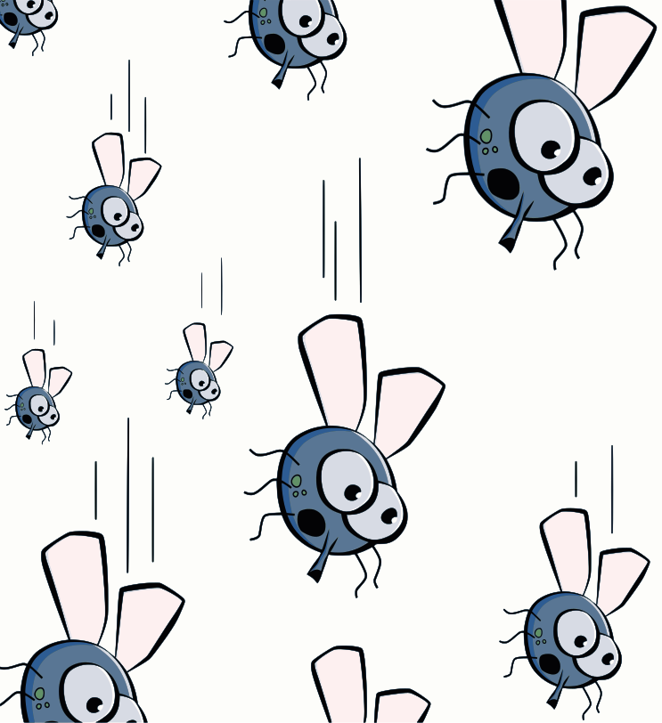 This features a pattern of various flies, each with different expressions and poses. Some of the flies are flying in the air while others appear to be falling or crashing into one another. There is a mix of blue and pink colors throughout the scene, adding visual interest to the overall design. The flies vary in size and position, creating an engaging and dynamic pattern that captures the viewer's attention.