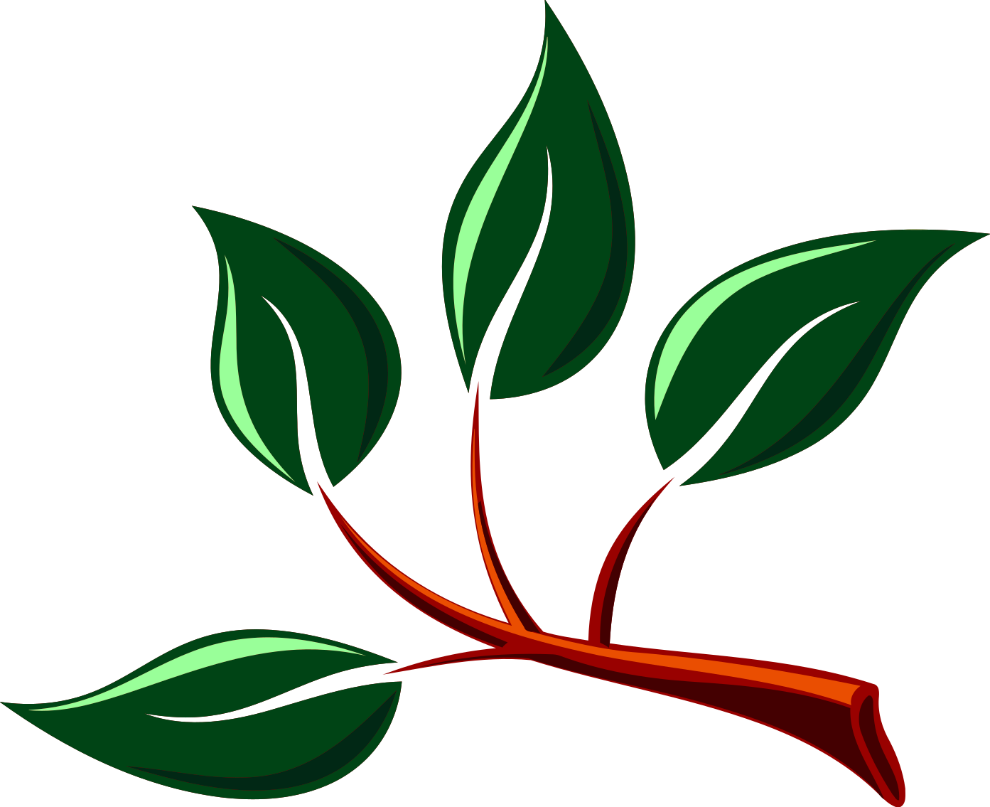 This features a green leaf with a brown stem, which is part of a branch. This branch has four leaves attached to it, and they are all green in color. The leaves appear to be well-drawn and detailed, giving the impression that this could be an artistic representation or a real-life depiction of a tree branch.