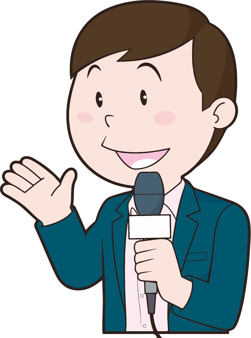 This features a cartoon man wearing a suit and tie, holding a microphone to his mouth. He appears to be giving a speech or interviewing someone. The man is smiling as he speaks into the microphone, creating an engaging atmosphere for those listening. His attire suggests that he might be in a professional setting, such as a news broadcast or conference. Overall, the image conveys a sense of confidence and authority through the use of both visual elements and body language.