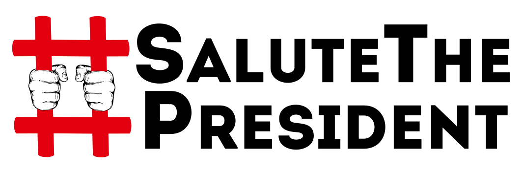 This features a red and white sign that says "Salute the President." The sign is made up of several squares, each containing a hand giving a thumbs-up gesture. These hands are arranged in various positions around the sign, creating an eye-catching display. The overall design of the sign suggests it could be used for promoting a political event or showing support for the president.