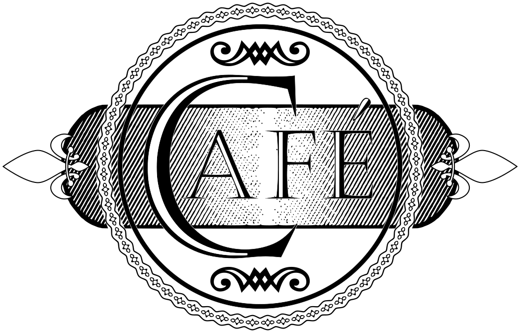 This features a black and white logo for the "Cafe" brand. The design is reminiscent of Victorian style, with an ornate border surrounding the central letter "C". The letter itself has a decorative flourish on top, adding to its elegance. The overall effect is a classic and sophisticated appearance that evokes a sense of history and tradition.
