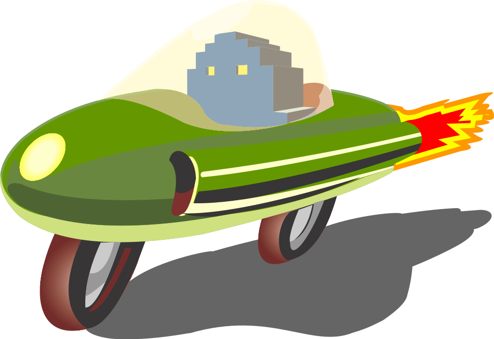 This features a futuristic green bike with a flame coming out of it, giving the impression that it is flying through the air. A blue alien-like creature is sitting in the driver's seat, steering the vehicle. The scene appears to be set on a dark background, which adds an element of mystery and intrigue to the image. Overall, this illustration showcases a unique blend of technology and fantasy, creating a visually captivating piece of artwork.