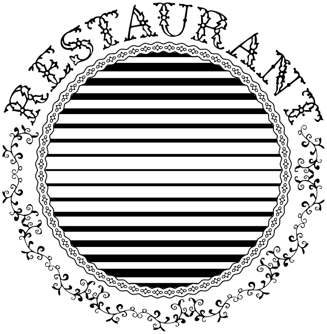 This features a round, ornate design with a black and white color scheme. It appears to be an emblem or logo for a restaurant, possibly featuring the name "Restaurant." The design is intricate and detailed, giving it a Victorian style appearance. The overall effect of the image is elegant and sophisticated, making it suitable for use as a logo or decorative piece.