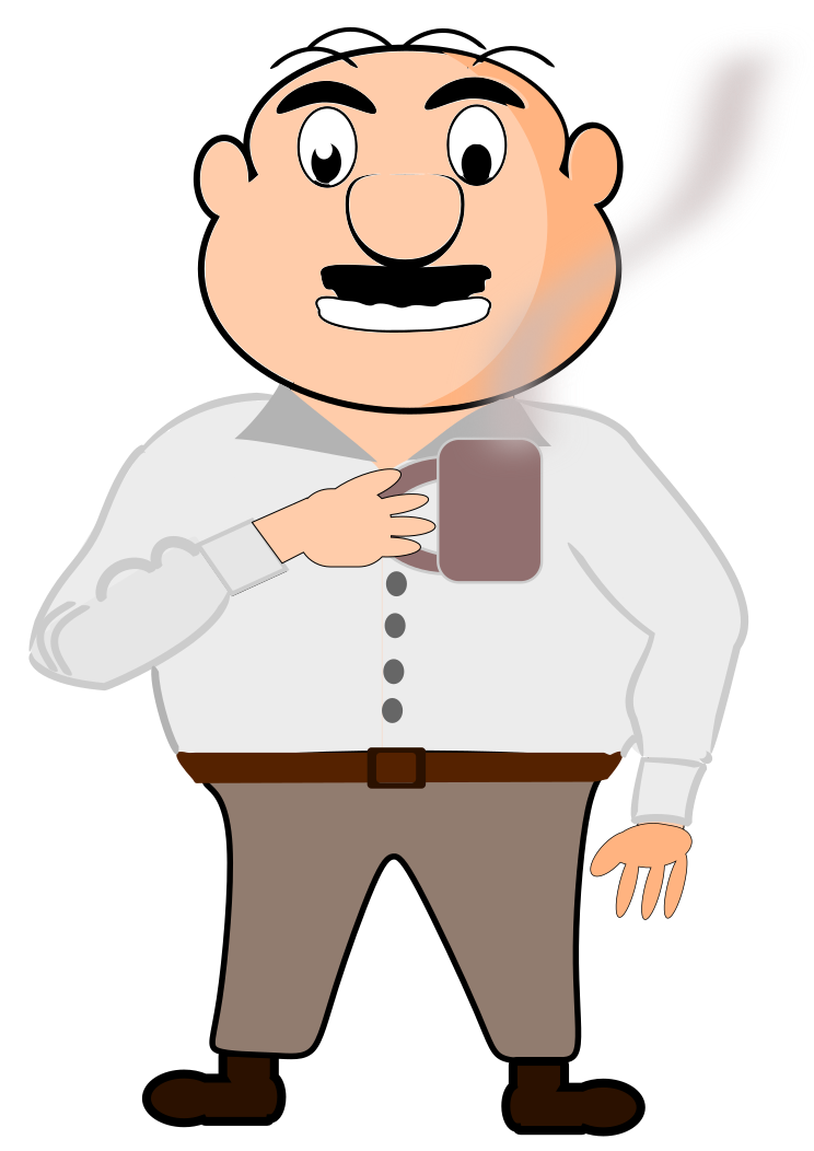 This features a cartoon illustration of an older man with a mustache, wearing a white shirt and tie. He is holding a cup of coffee in his hand, giving the impression that he is enjoying a hot beverage. The man appears to be standing confidently, possibly posing for a picture or simply going about his day. The illustration has a whimsical and playful feel to it, capturing the essence of a typical morning routine for many people.