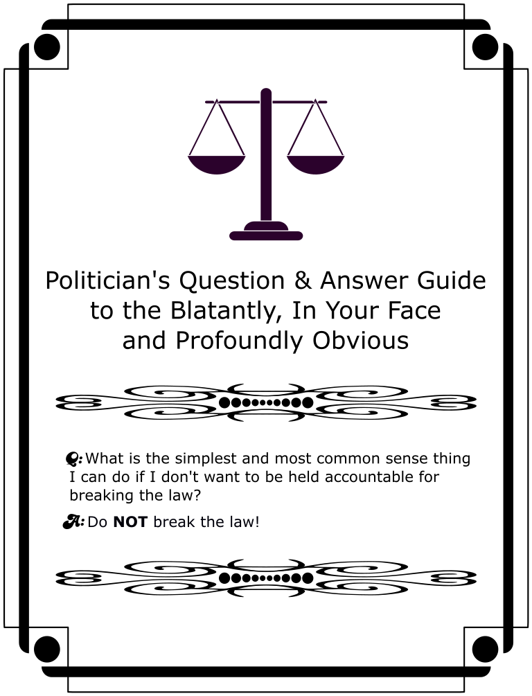 This features a book cover with an old-fashioned design, showcasing a scale of justice and a judge's gavel. The title of the book is "Politician's Question & Answer Guide to the Blatantly, in Your Face and Prodigiously Obvious." This guide appears to be written for those who want to understand the simplest and most common sense things that they can't seem to grasp. The cover also includes a quote from the book, which reads "What is the simplest and most commonly sense thing I can't seem to hold accountable for breaking the law? Do not break the law!"