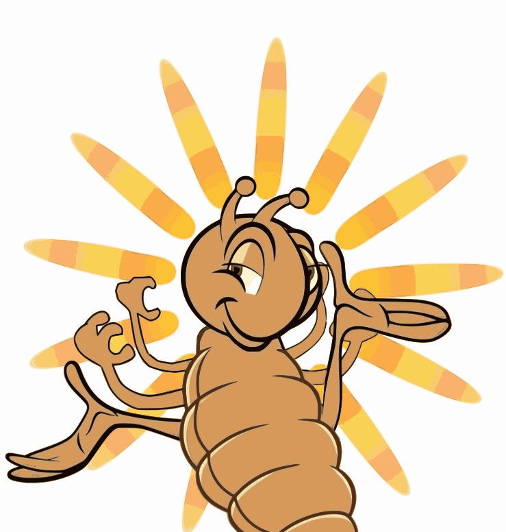 This features a colorful cartoon-like illustration of an insect, possibly a grasshopper or a beetle. It is standing on its hind legs and appears to be smiling at the viewer. The insect's body is brown with yellow accents, giving it a friendly and inviting appearance. In addition to the main insect, there are several smaller yellow circles scattered throughout the image, adding more visual interest and depth to the scene.