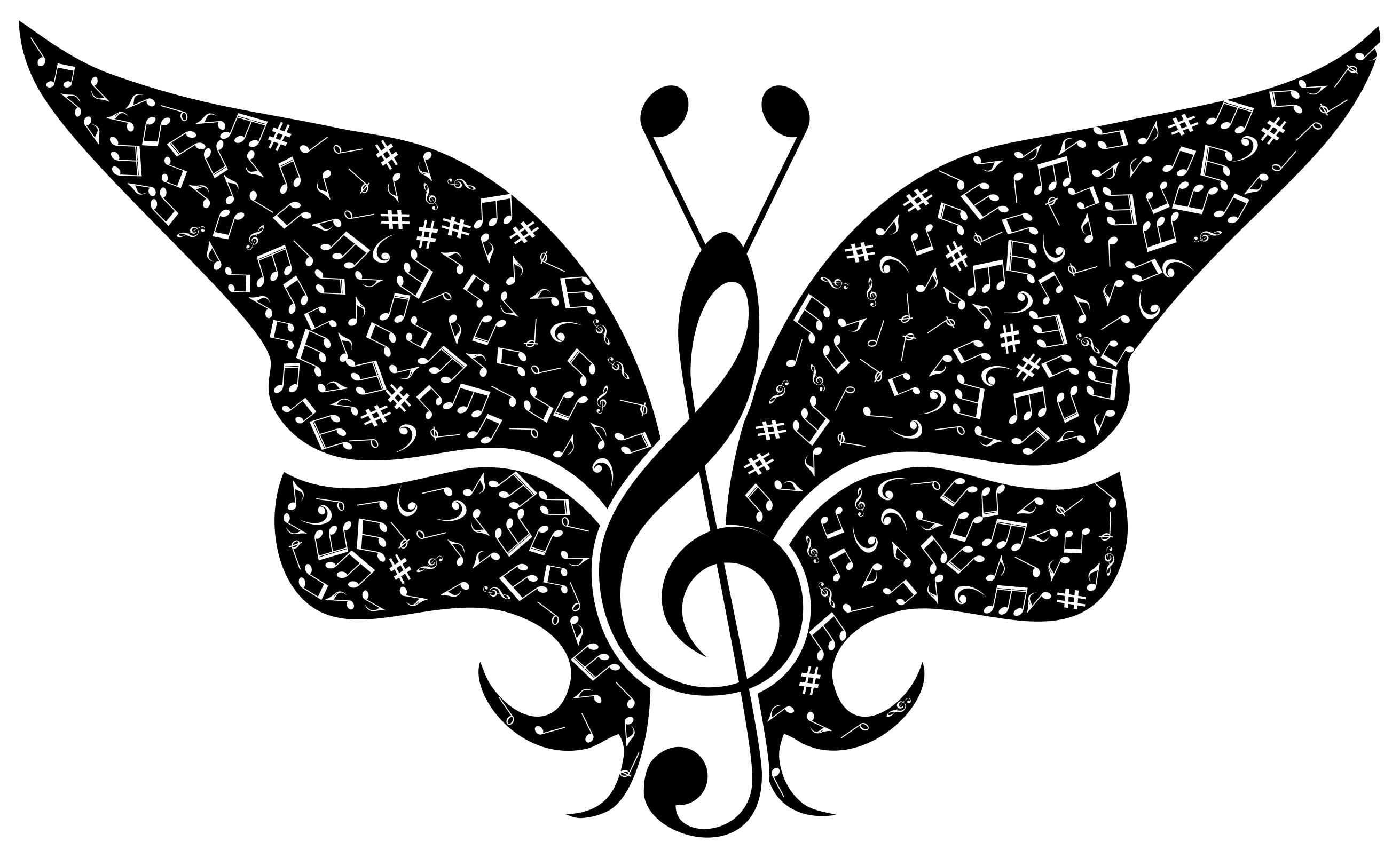 This features a unique and creative design of a butterfly with a musical note as its main body. The butterfly has black wings, which are filled with small white dots, giving it an intricate appearance. The musical note is positioned in the center of the butterfly's body, adding a touch of artistic flair to the design. This imaginative combination of elements creates a visually appealing and interesting image that combines nature and music.