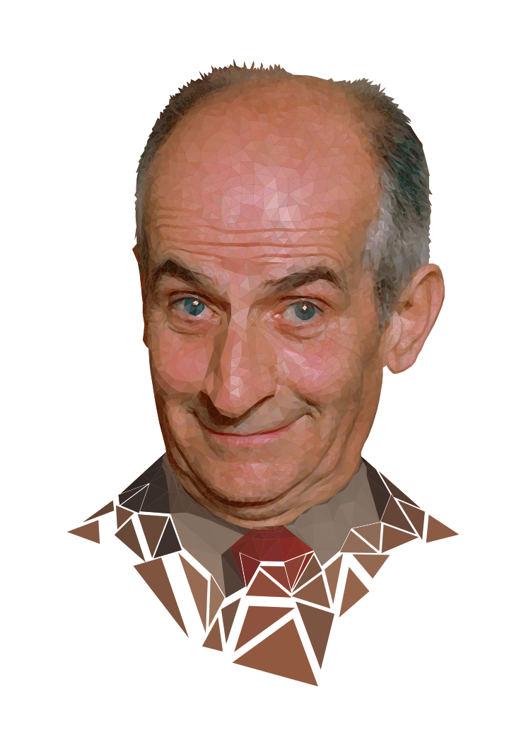 This is a portrait of an older man with white hair and a red tie. He has a smiling expression on his face, giving the impression that he's enjoying himself. The man appears to be wearing a suit jacket, which adds to the formality of the scene. The portrait itself is made up of polygons, creating an interesting visual effect. Overall, it's a unique and creative representation of the man in question.