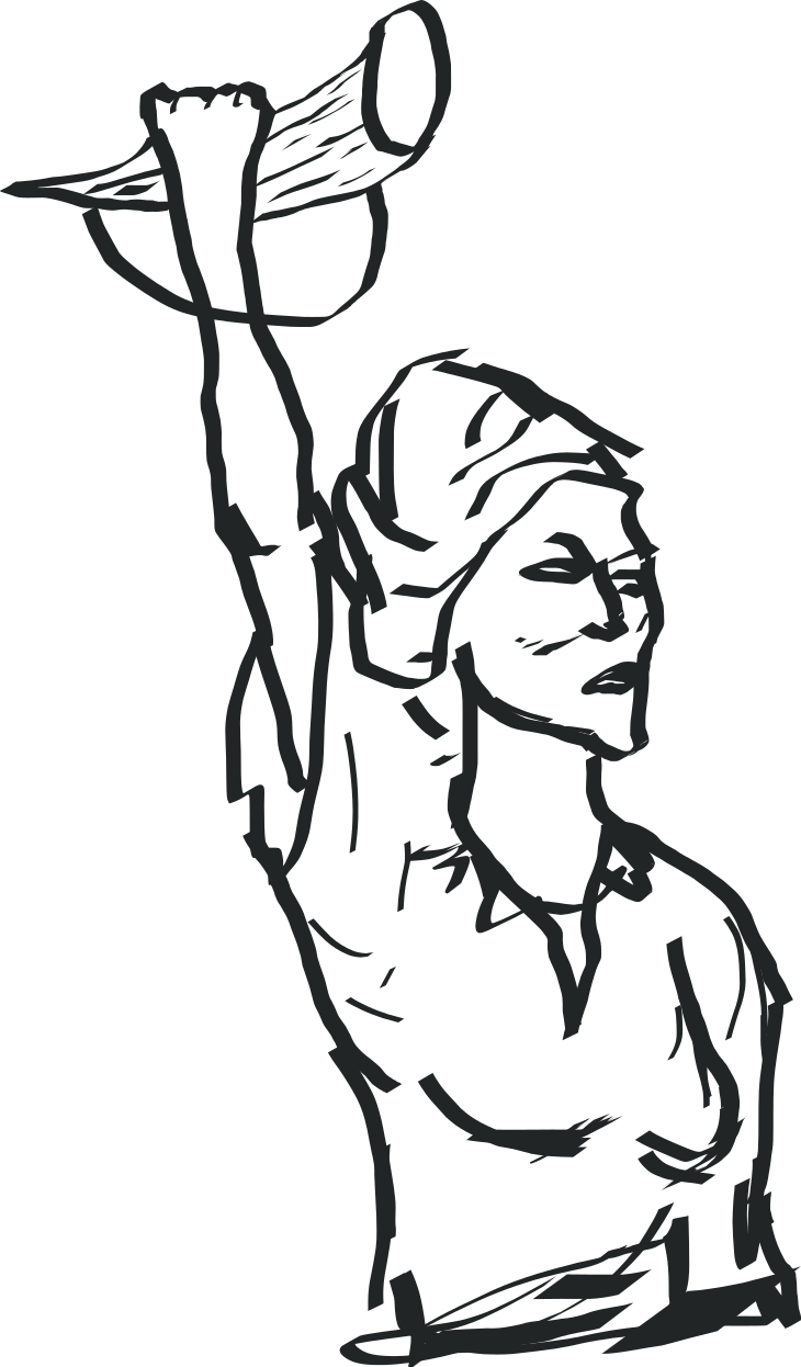 This features a woman holding a large metal object, possibly a vase or a pitcher. She is standing in front of a wall with her arms raised high above her head, giving the impression that she is celebrating or triumphantly displaying the item she holds. The drawing itself appears to be black and white, adding an artistic touch to the scene.