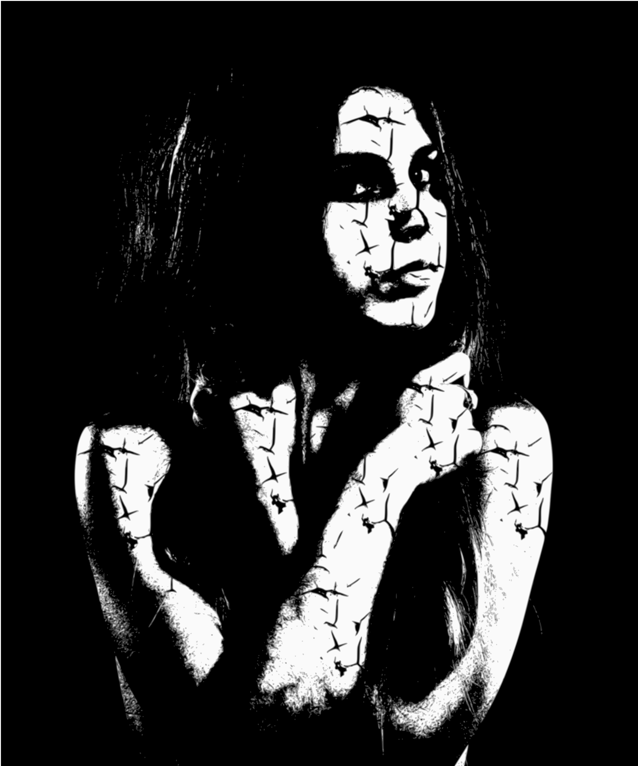 This is a black and white photo of a young woman with her face painted to look like a monster. She has a scared expression on her face, giving the impression that she is frightened or uncomfortable. Her skin appears to be cracked and damaged, adding to the eerie atmosphere of the scene. The woman's hair is pulled back, further emphasizing her fearful demeanor. Overall, the image creates a sense of unease and tension through its use of lighting, makeup, and the subject's facial expression.