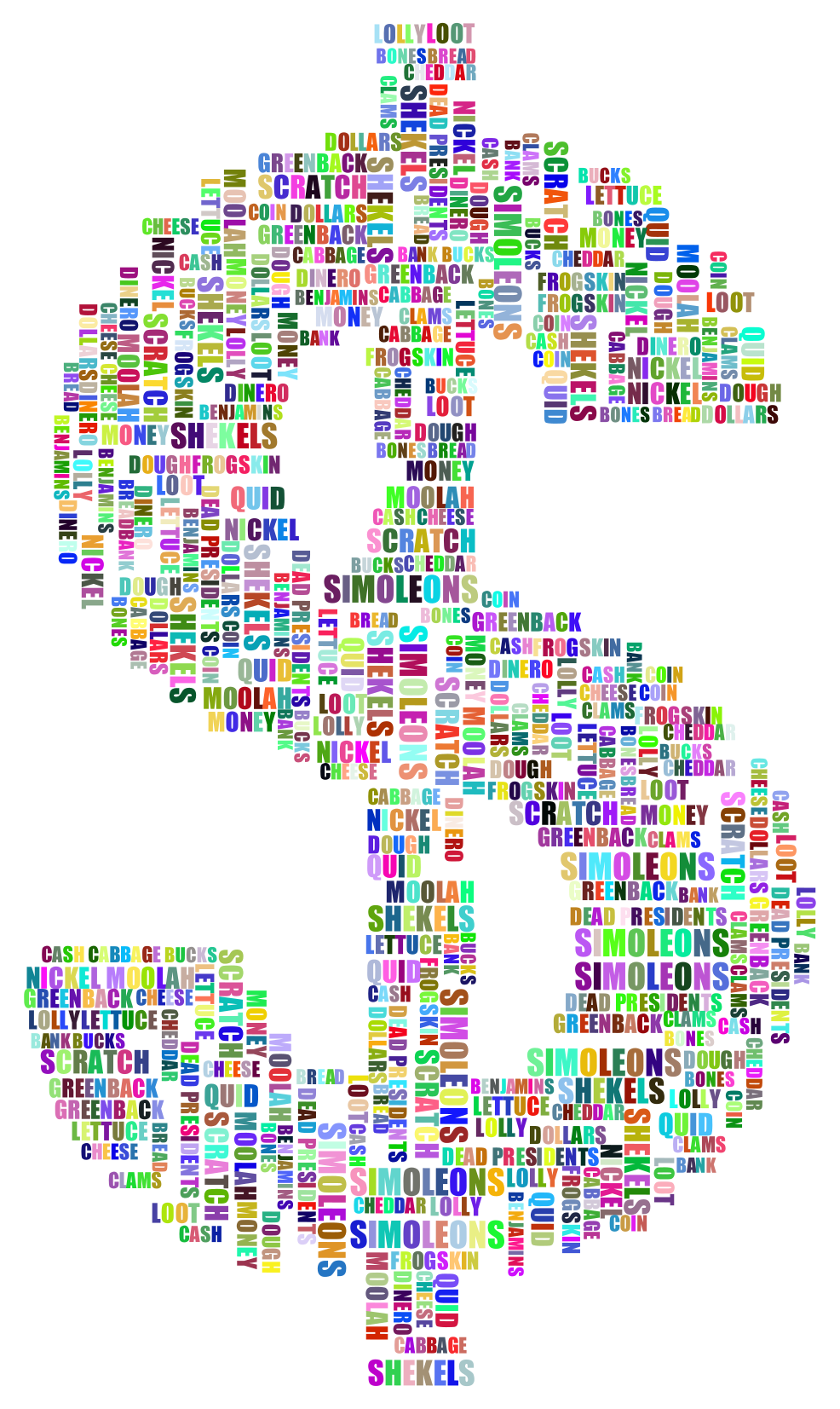 Tags: abstract, art, cash, chromatic, colorful, currency, dinero, dollar sign, dough, filthy lucre, greed, money, moolah, prismatic, rainbow, symbol, tag cloud, text, type, typography, word cloud, word, dollar bill